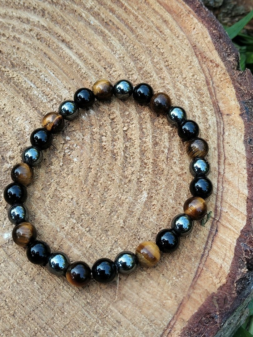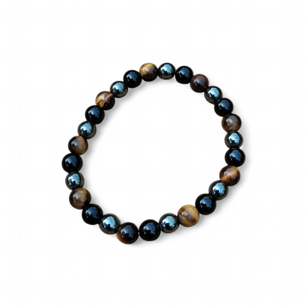 Bracelet “3 protections” en perles d’obsidienne noire, œil de tigre et hématite sur élastique résistant. Un trio associé à la protection, l’ancrage et la confiance, au quotidien.
