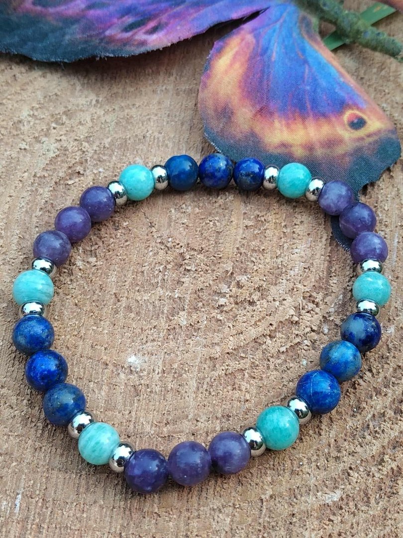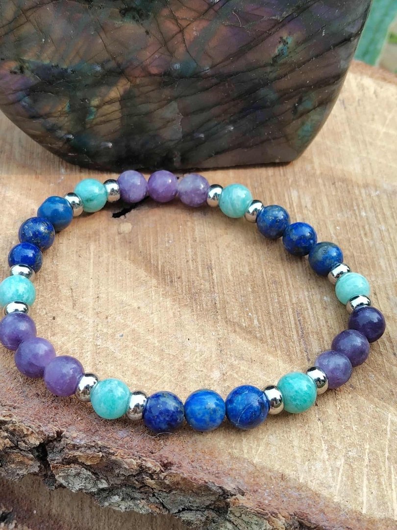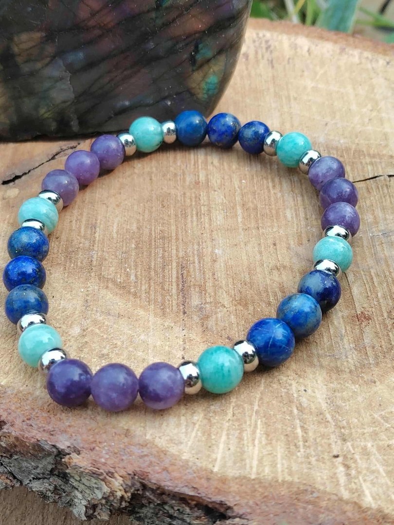 ud83dudcab Laissez-vous envelopper par la vibration du lapis lazuli, de la lépidolite et de l’amazonite, et faites de ce bracelet votre rituel bien-être au poignet.