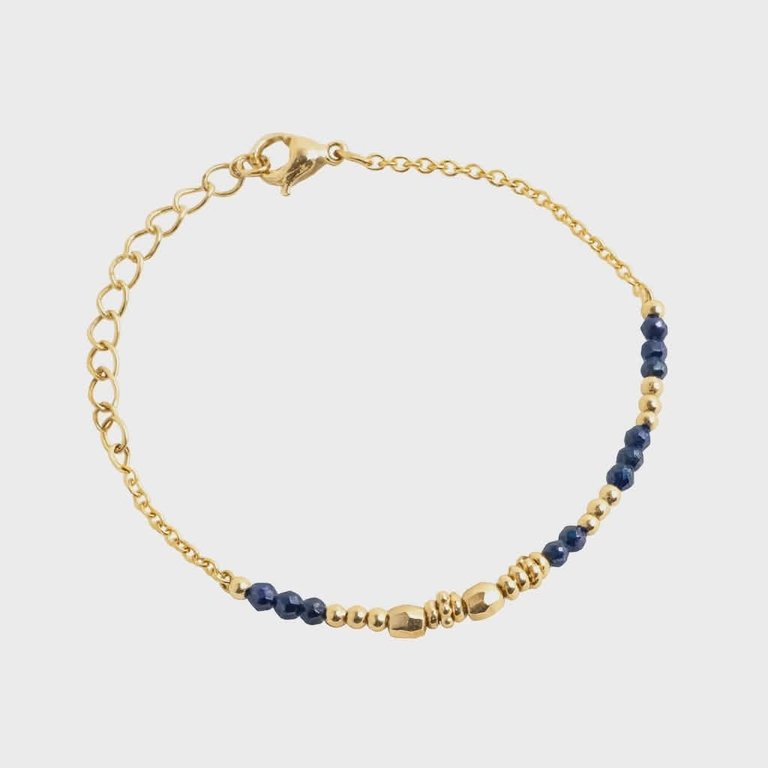 Un bijou d’une finesse absolue, pensé pour vous accompagner au quotidien avec élégance et discrétion. Ce bracelet doré à chaîne fine met en lumière le bleu profond et hypnotique des perles de lapis-lazuli, subtilement rehaussé par l’éclat de petites billes dorées. Nous l’avons sélectionné pour son design minimaliste et sa polyvalence : il se porte aussi bien seul pour une touche de raffinement subtile, qu’en accumulation avec vos autres bijoux favoris pour un style plus affirmé.