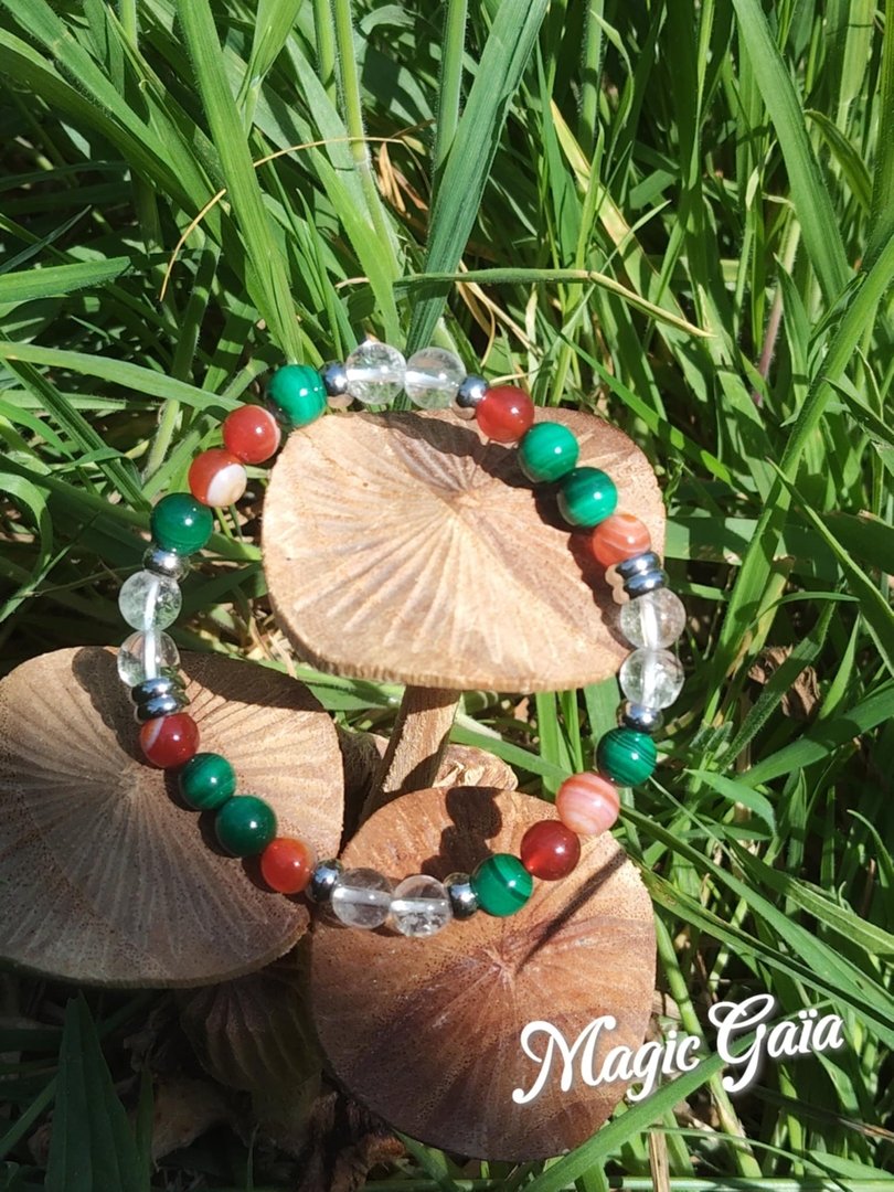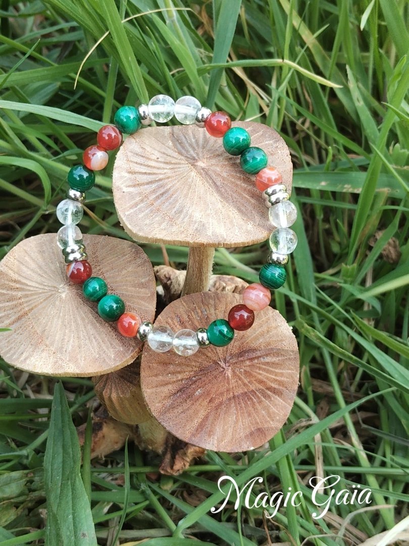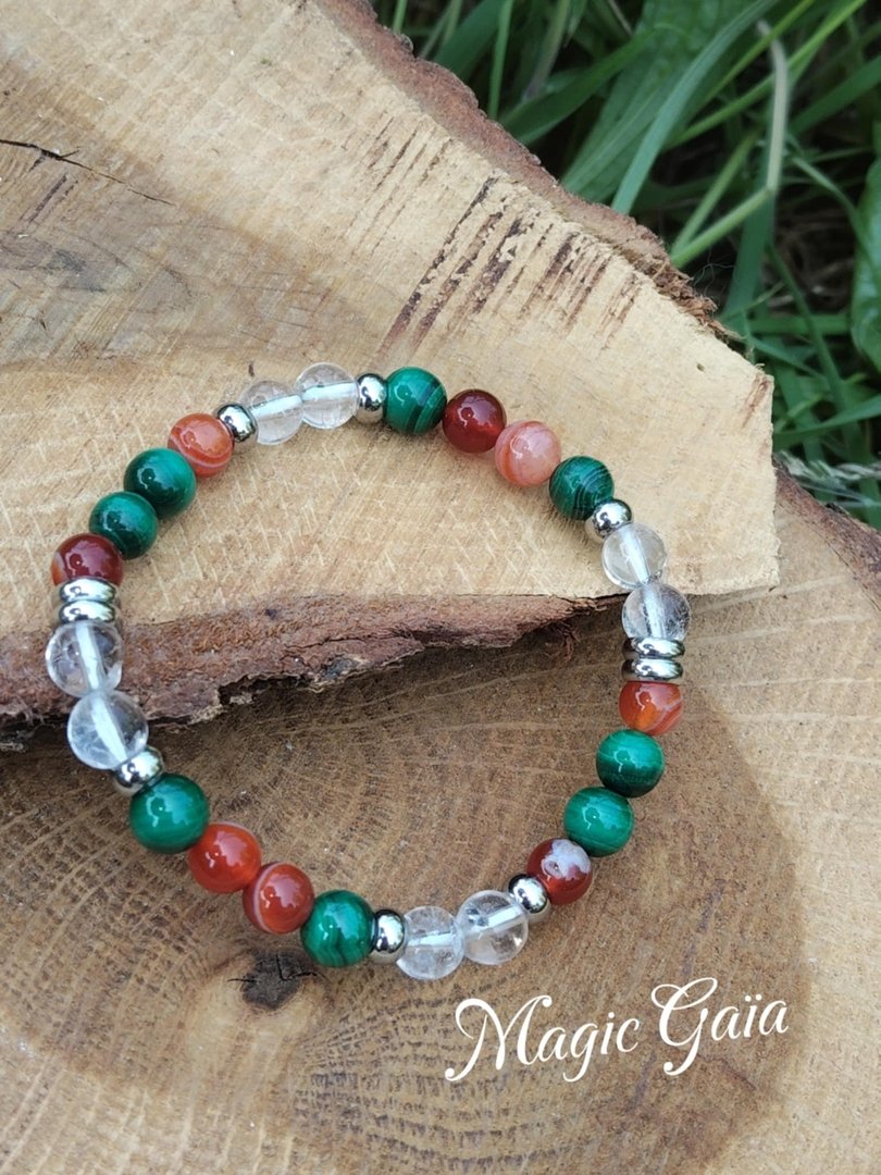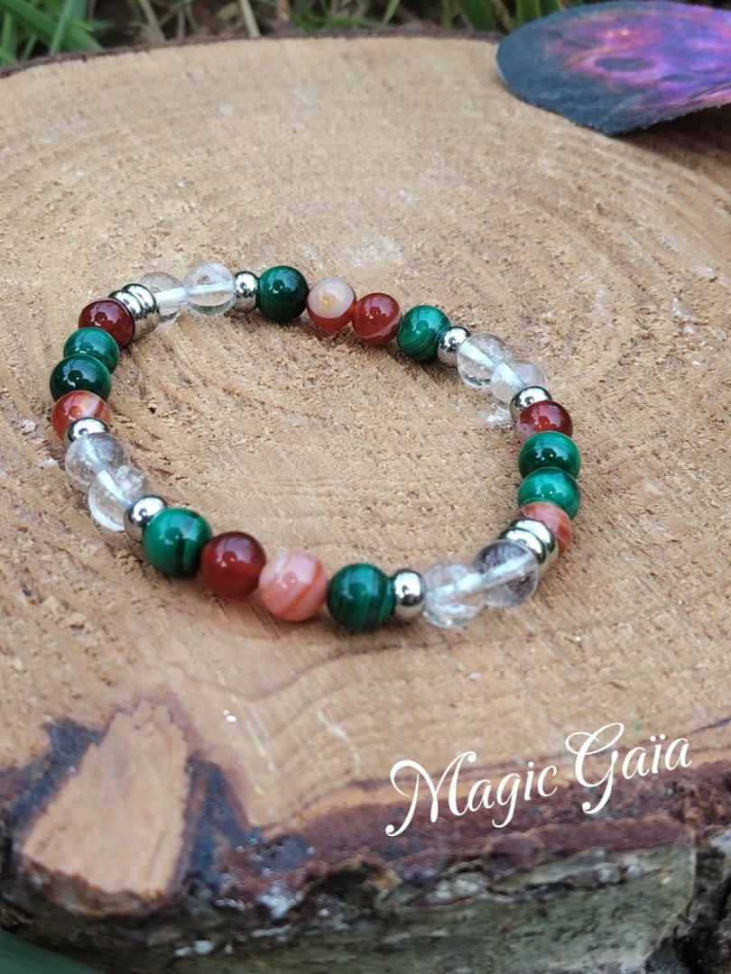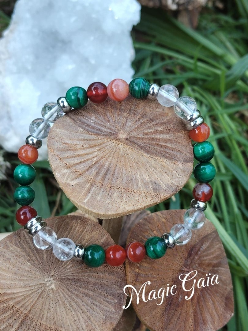 Le bracelet prémenstruel Magic Gaïa est composé de pierres naturelles spécialement sélectionnées pour leurs propriétés anti-douleurs et anti-inflammatoires. La malachite agit comme un analgésique naturel, la cornaline améliore la qualité du sang et aide à stopper les hémorragies, tandis que le cristal de roche amplifie les énergies bénéfiques.