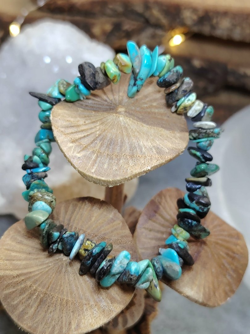 Bracelet en turquoise baroque aux éclats naturels, monté sur élastique pour un port facile et confortable. Chaque pierre est unique : formes, nuances et veinages varient, ce qui rend chaque bracelet différent. Un bijou au style brut et authentique, parfait à porter seul ou en accumulation.