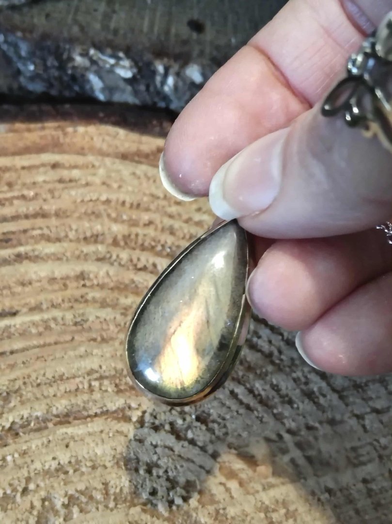 Sa labradorescence aux reflets rehaussée d’éclats jaunes, orangés et rosés capte la lumière à chaque mouvement; pièce unique au style minéral et raffiné. on l’associe à la protection, l’ancrage et l’intuition (repères non médicaux). À porter près du cœur; chaque pierre est unique.