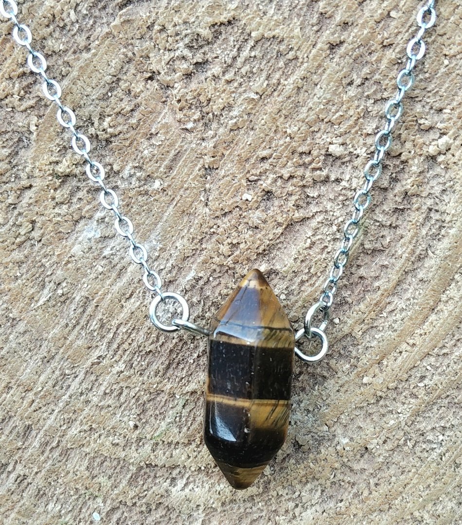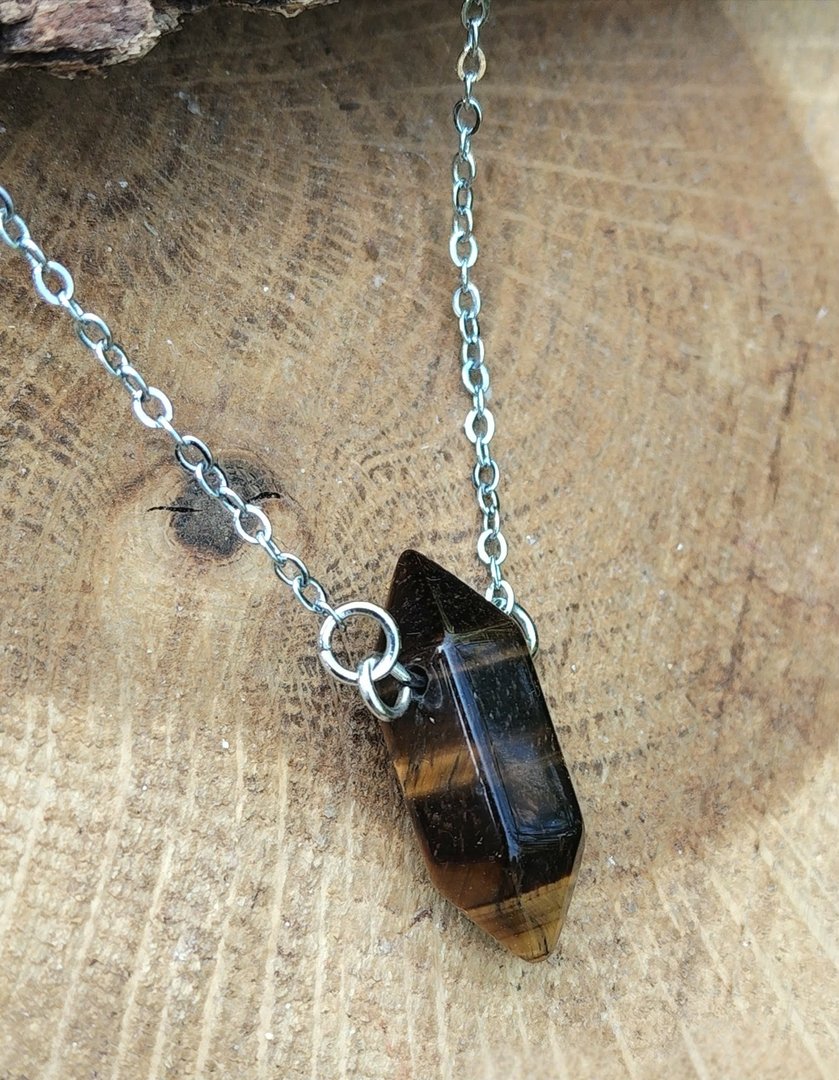 u2728 Pendentif Pointe en oeil de Tigre – Chaîne Acier Inoxydable