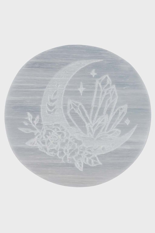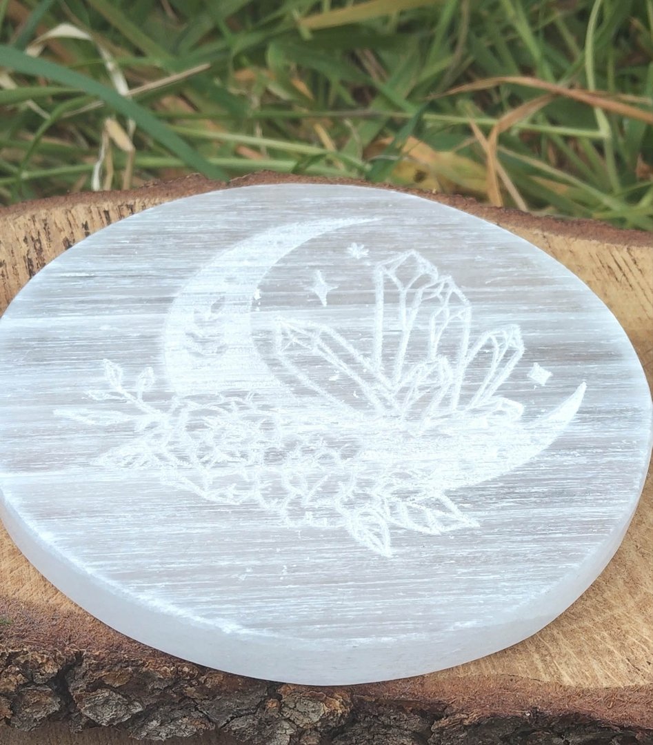 Ce plateau en sélénite, gravé d’un croissant de lune, de cristaux et de fleurs, est un véritable petit autel de lumière.