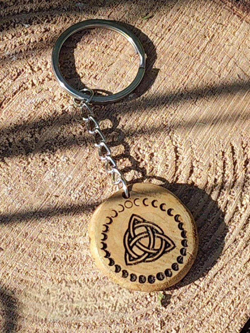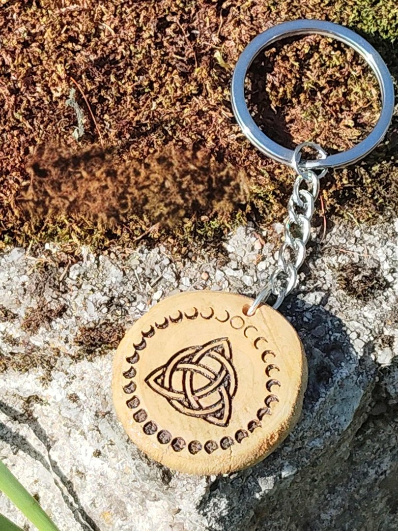 Ce porte‑clés triquetra en bois naturel gravé s’emporte partout : sur vos clés ou en bijou de sac ud83dudc5c. Le Triquetra, symbole celtique d’unité et de féminité sacrée, s’unit aux phases de la Lune ud83cudf17 pour vous rappeler, en douceur, vos cycles, vos intentions et votre protection intérieure.